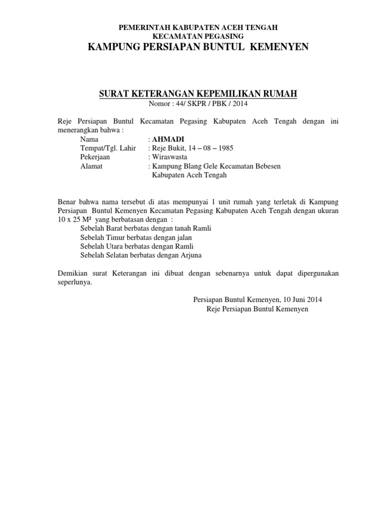 Contoh Surat Keterangan Kepemilikan Rumah Yang Benar Bloggadogado