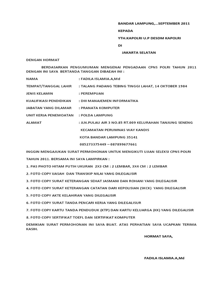 Contoh surat lamaran cpns polri 2021. Rincian meliputi 228 formasi untuk Unit Organisasi Kementerian Pertahanan. Nikita Mirzani Blak-blakan Sudah Hampir 2 Tahun Tidak Begituan. Contoh Surat Lamaran Cpns Polri - Cpns kemenkumham 2019 kemenkumham membuka lowongan cpns 2019 sebanyak 4 598 formasi.