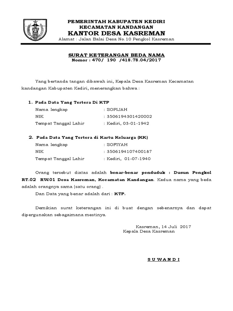 Surat Keterangan Beda Nama Dari Kepala Desa